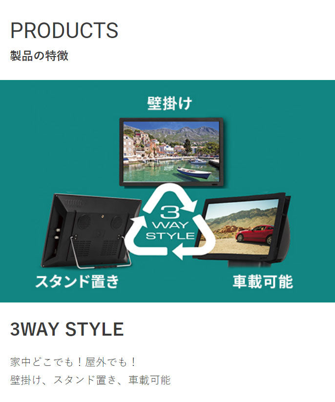 壁掛け、スタンド置き、車載可能3WAYSTYLE
