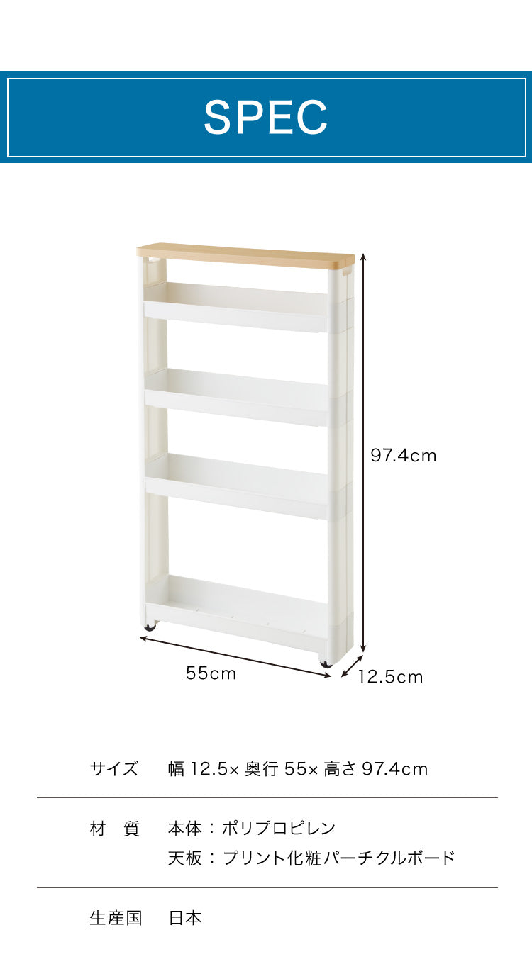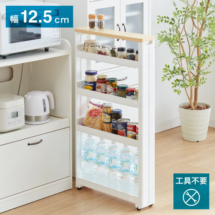 幅わずか12.5cmで冷蔵庫・食器棚・洗濯機横などのすき間に収納ができます。