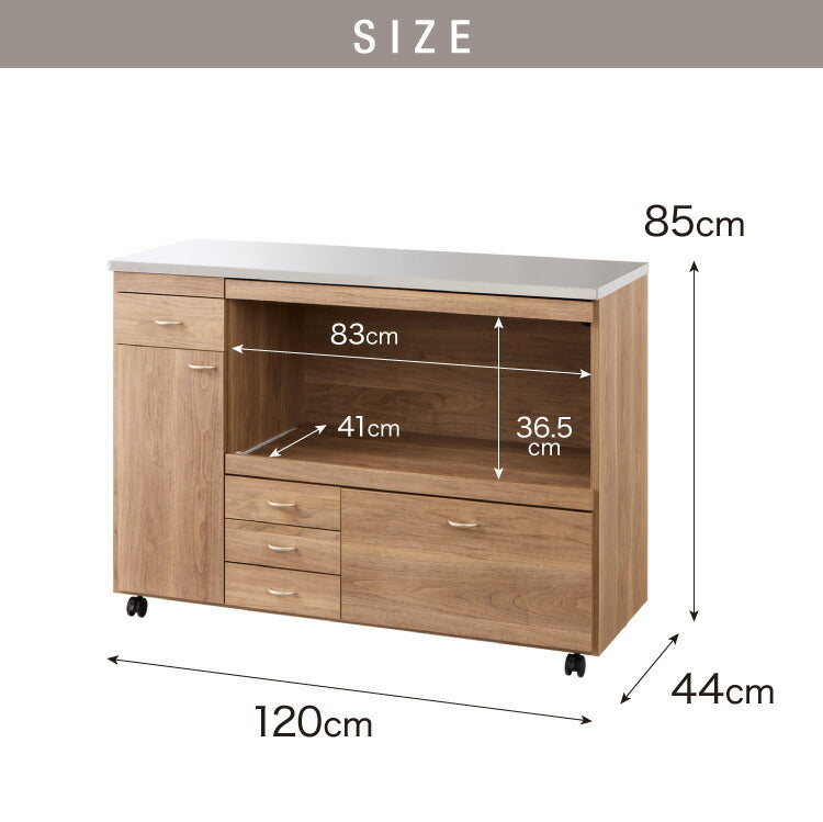 日本製 キッチンカウンター ステンレス天板 完成品 幅120 間仕切りキャスター付き スライド棚 コンセント付き 食器棚 一人暮らし 国産 キッチンボード おしゃれ (代引不可)