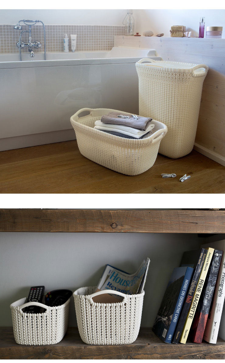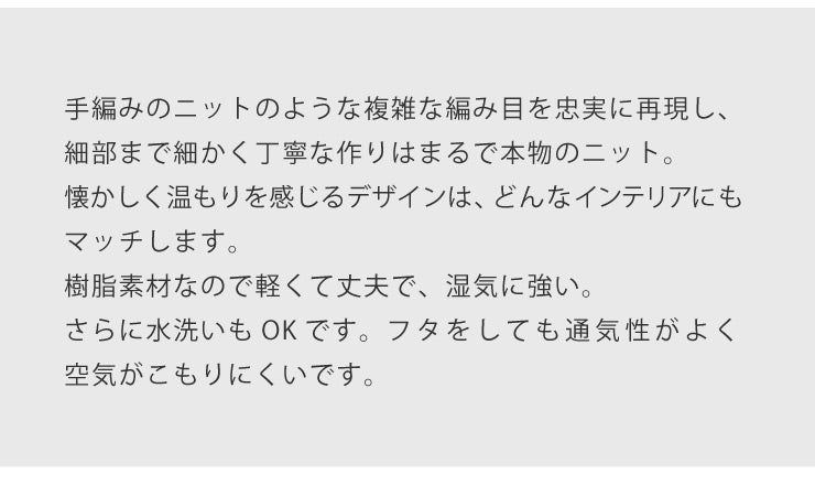 手編みのニットを繊細に表現した扱いやすくおしゃれな樹脂バスケットです。