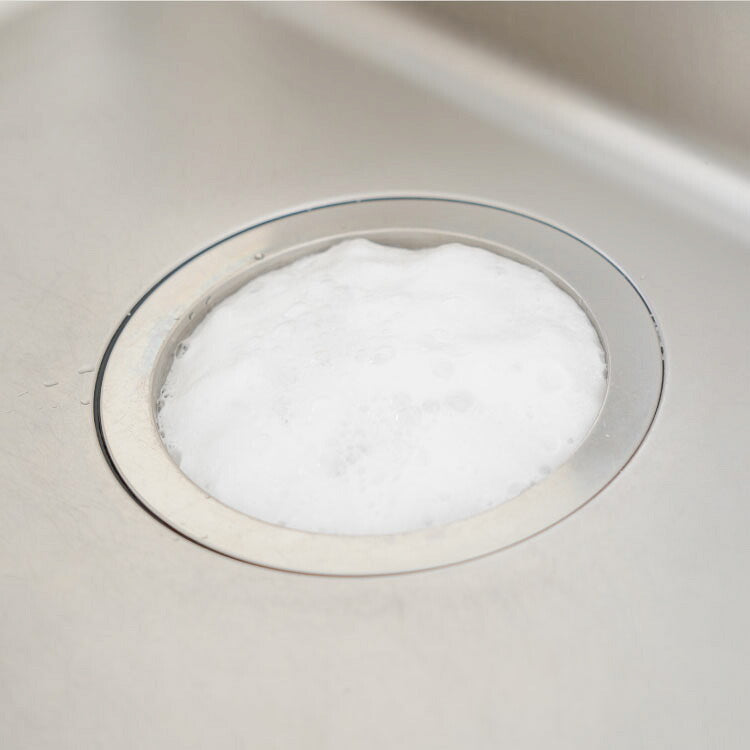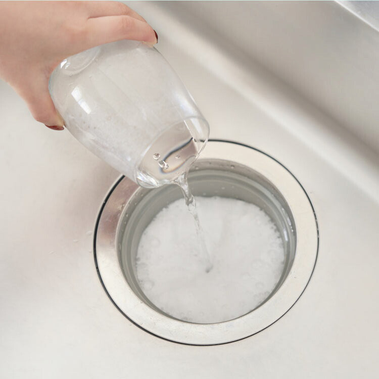 1. 排水口のゴミ受けを外し、1袋(30g)を排水口に入れ、コップ1杯分のぬるま湯(40℃~50℃)を本剤にゆっくり流しかけてください。