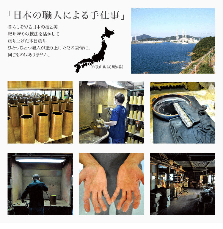 「日本の職人による手仕事」暮らしを彩る日本の技と美。紀州塗りの技法を活かして塗り上げた木目塗り。ひとつひとつ職人が塗り上げたその表情に、同じものはありません。