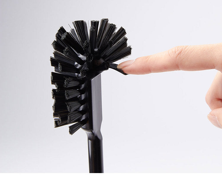 細かい部分も洗いやすく、表面を傷つけにくいソフトタッチのブラシ。水跳ね防止のガード付。便器のフチ裏にしっかりフィット。握りやすい太めのグリップ。