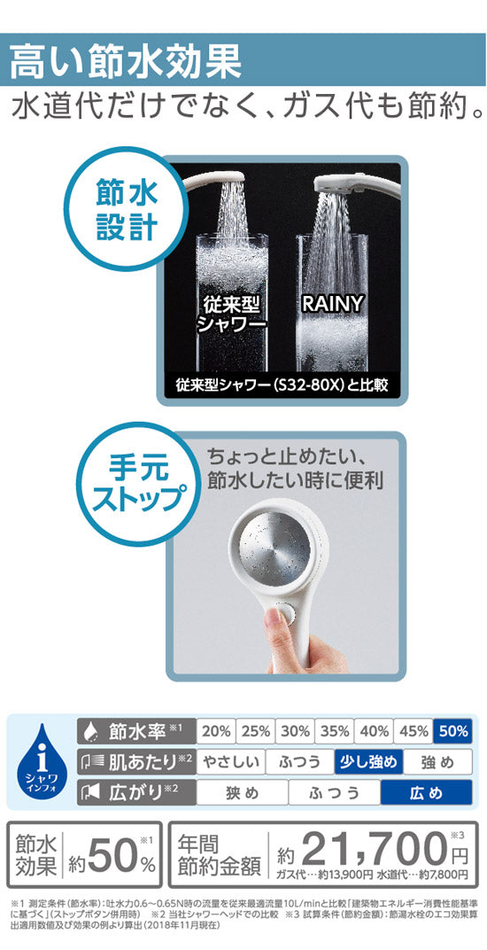 50% 節水シャワーヘッド レイニーストップ RAINY STOP シャワーヘッド 水圧アップ 水圧 強い シャワー ヘッド 手元 ストップ ボタン付き