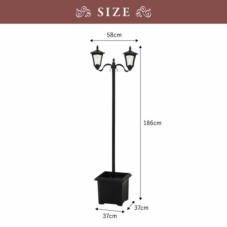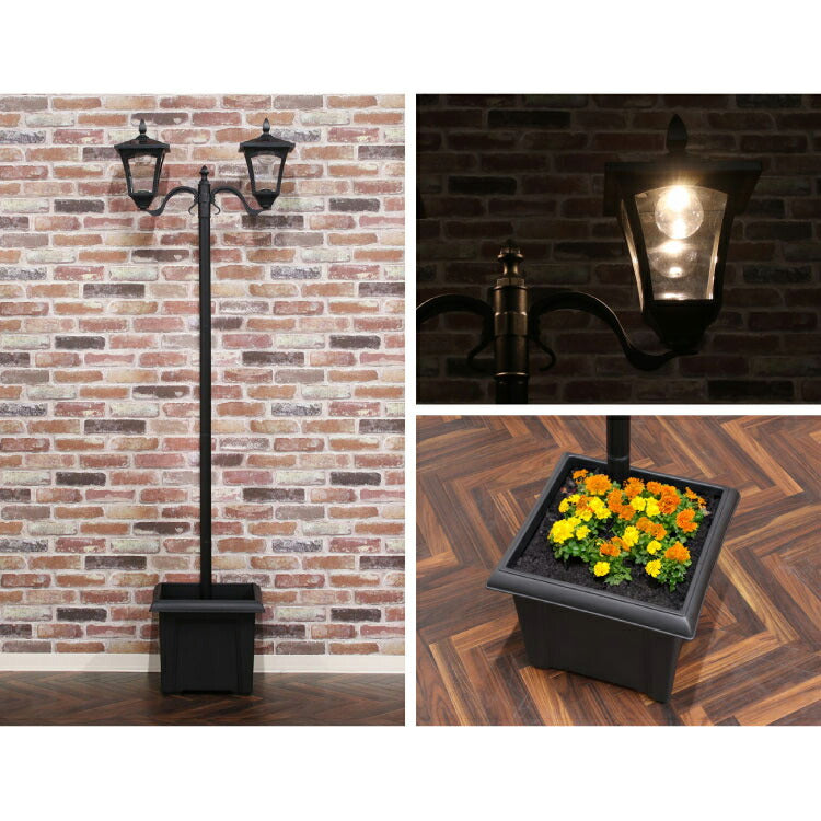 ソーラースタンドライト プランター付き 2灯 LEDライト ガーデンライト ソーラー充電 照明 外灯 門灯 防塵 防水 屋外 ガーデン 玄関 防犯 アンティーク ガス灯(代引不可)