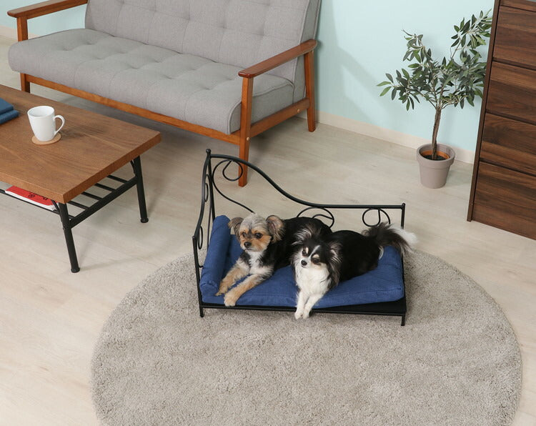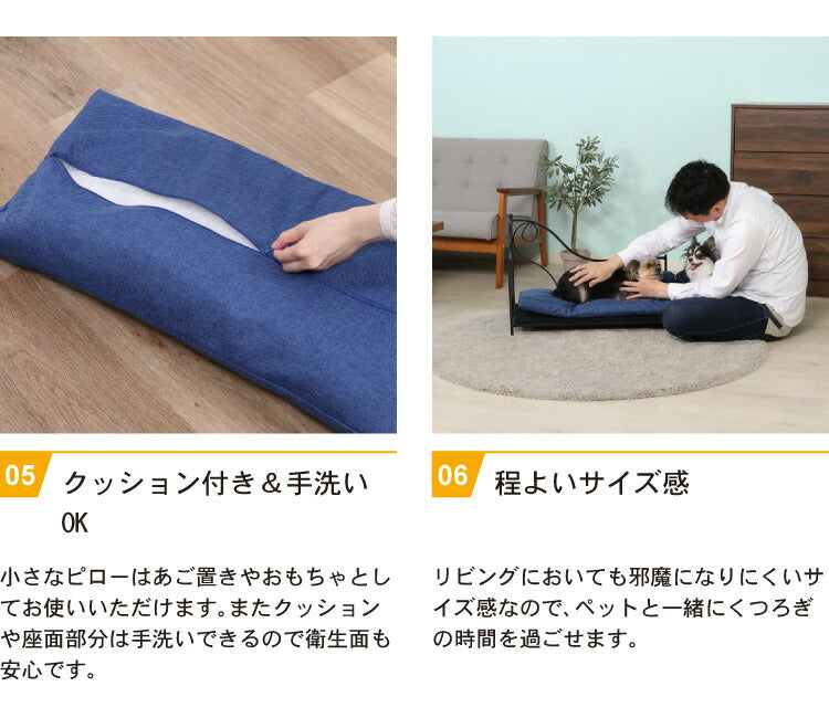 優美な曲線を描く高級感のあるアイアンフレームデザイン。背もたれや脇のクッションにあごを乗せたり好きな姿勢で思う存分くつろげます。夏はべたつかず、冬はひんやりとしない、ファブリック素材を使用しています。座面までの高さは約13.5cmで足の短いワンちゃんや猫ちゃんにも優しいロータイプ。ストレスなくベッドに上がることができます。小さなピローはあご置きやおもちゃとしてお使いいただけます。またクッションや座面部分は手洗いできるので衛生面も安心です。リビングにおいても邪魔になりにくいサイズ感なので、ペットと一緒にくつろぎの時間を過ごせます。