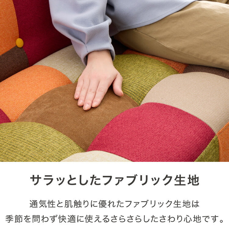 パッチワークの張地に合わせたカラフルボタンがキュートなコンパクトソファ。