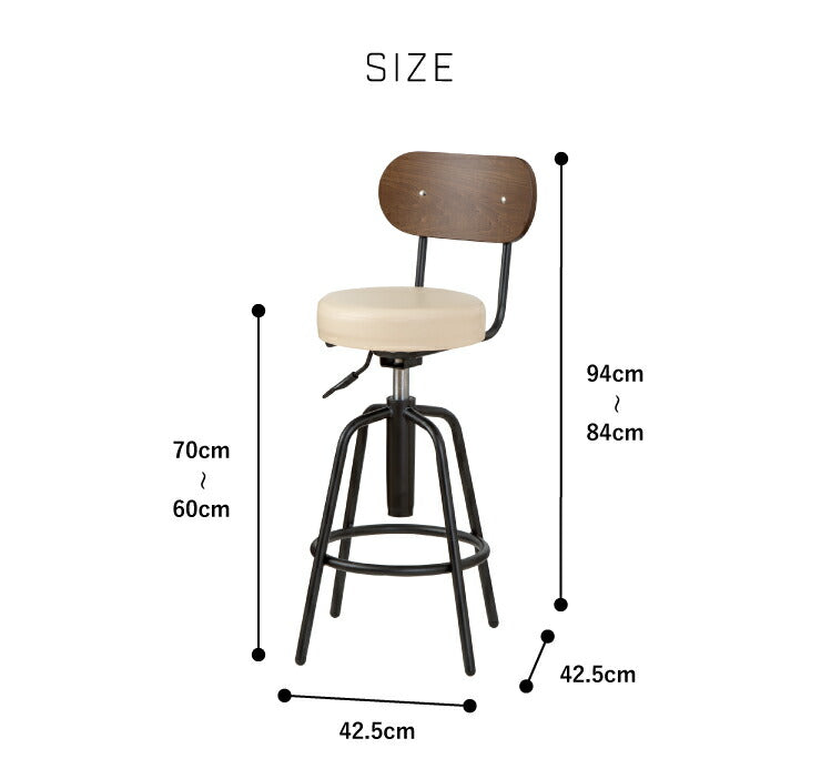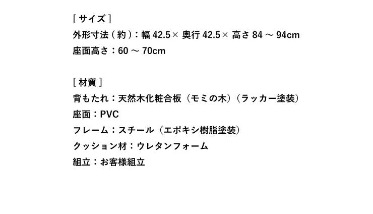外形寸法(約):幅42.5×奥行42.5×高さ84~94cm(座面高さ60~70cm)