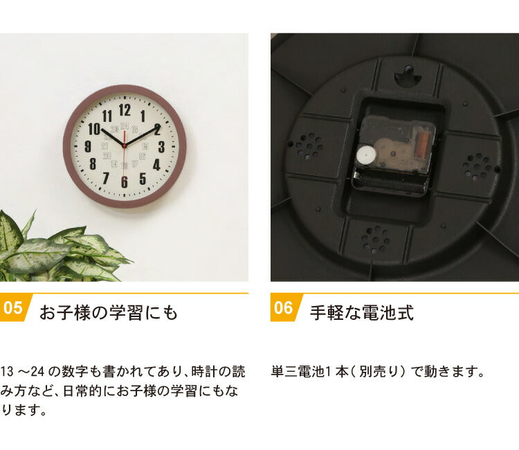個性的なレトロカジュアルなデザインです。味のあるお部屋のアクセントになります。13~24の数字も書かれており、時計の読み方など、日常的にお子様の学習にもなります。モノトーンで統一された文字盤なので非常に見やすい仕上がりです。