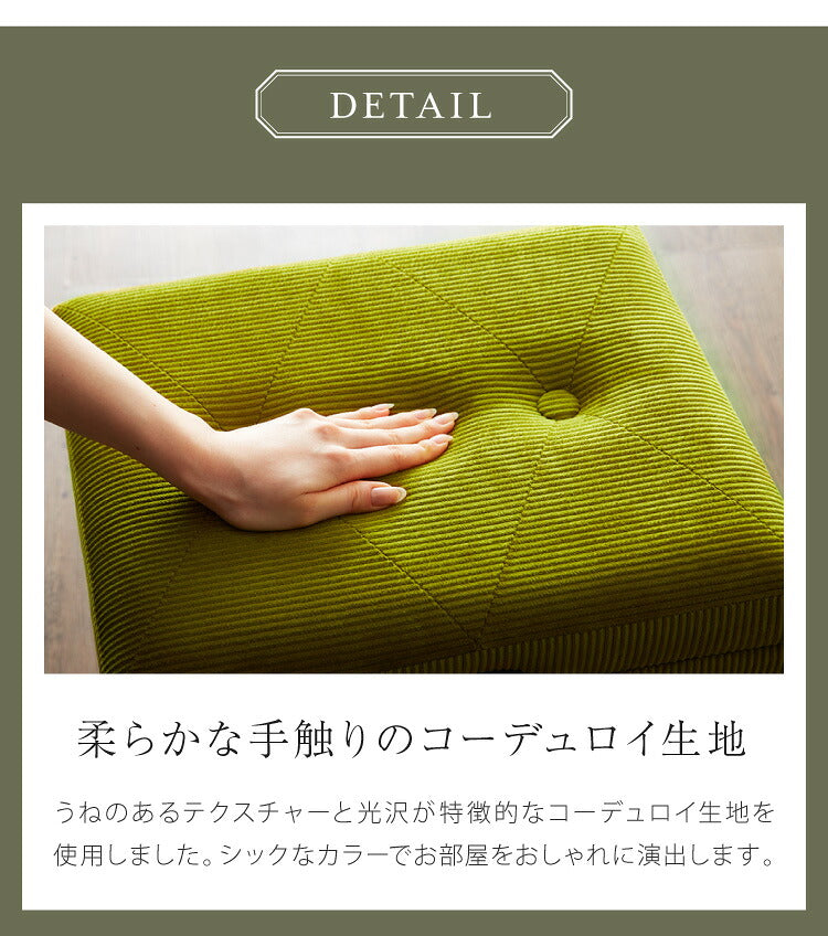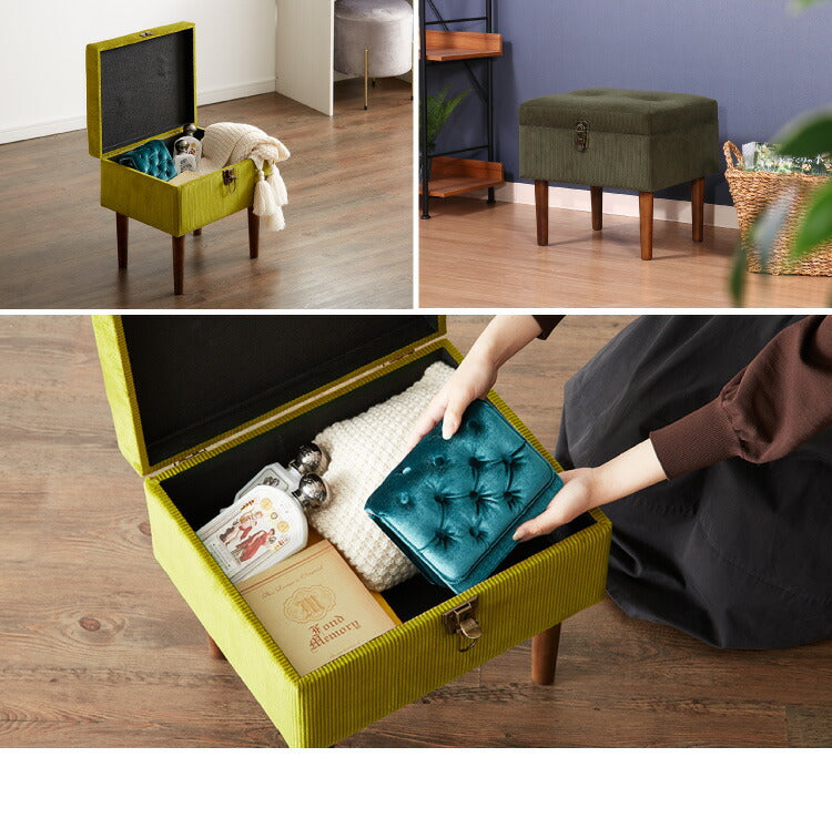 ふんわりしたコーデュロイ生地の天然木の丸脚を組み合わせたお洒落なトランクスツール。フタを開けると収納スペースになっております。