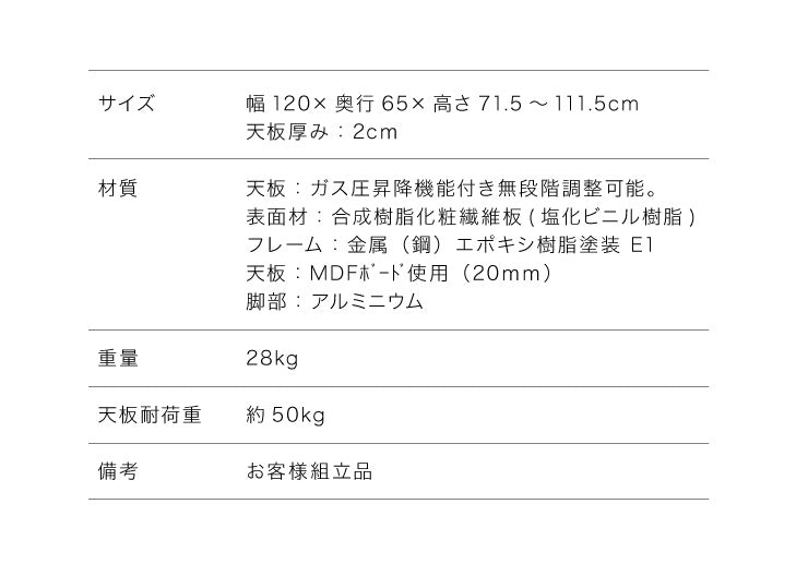天板ガス圧昇降機能付き。(可動域:715-1115mm)