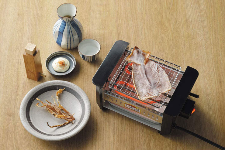 ●ガスコンロの直火と違い、串が焦げることがなくじっくりと丁寧に焼き上げます。網付で角モチやホタテなどの海産物も調理できるため晩酌のお供にピッタリ