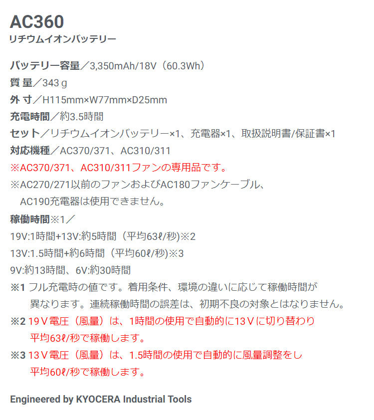 AC360バッテリーはAC370、AC371、AC310、AC311ファンの専用品のため、その他のエアークラフトファン・バッテリー・ケーブルと組み合わせて使用することはできません。