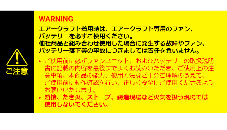 エアークラフト着用時はエアークラフト専用のファン、バッテリーを必ずご使用ください(他社商品と組み合わせて使用した場合に発生する故障やファン落下などの事故については責任を負いません)。