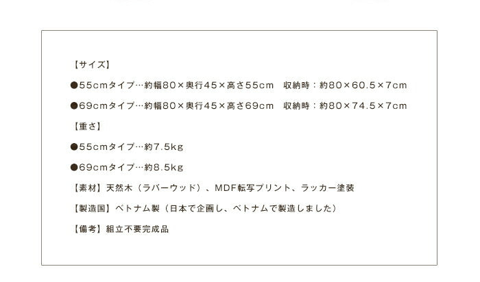 サイズ:使用時:約幅80×奥行45×高さ69cm、 収納時:約80×74.5×7cm
