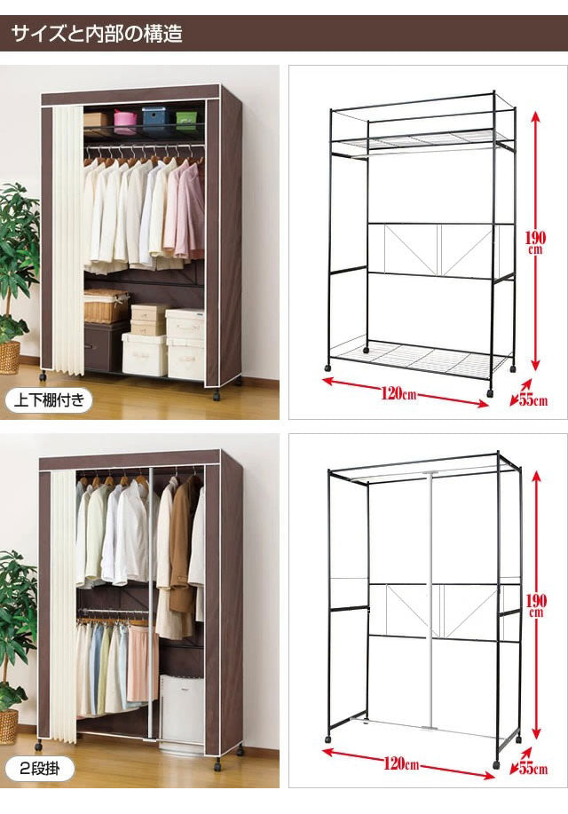 【商品説明】カバーとカーテン付きなので、衣類をほこりから守ります。衣類や小物の収納にも便利な上下棚付きタイプ・衣類の収納におすすめの2段掛けタイプと2種類からお選びいただけます。