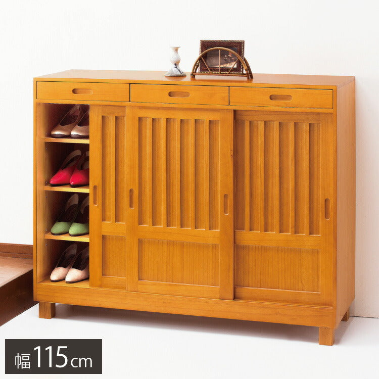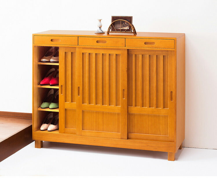 和風引き戸シューズボックス 3枚扉 天然木 幅115 奥行38 高さ95 シューズラック 下駄箱 靴箱 玄関収納 キャビネット 引き戸収納(代引不可)