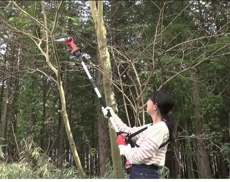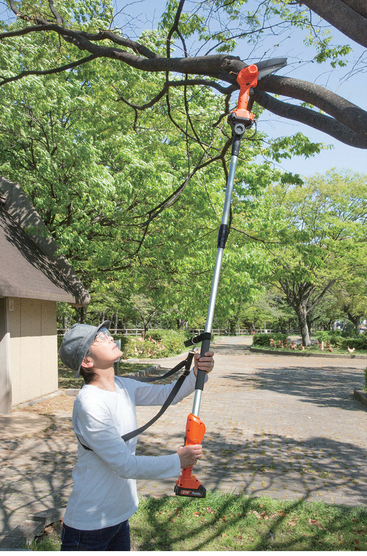 保護メガネ・肩掛けベルト付きで安全に高枝を剪定。