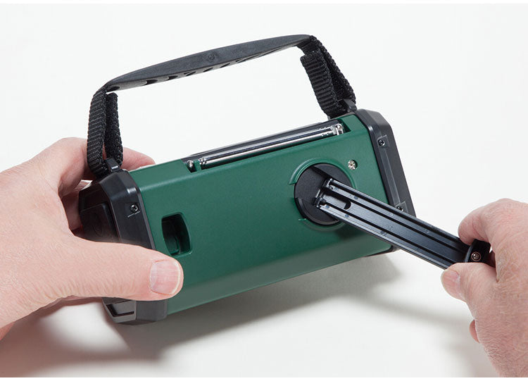 充電方法が3種類から選択可能(ソーラー充電、USB充電、手回し充電)