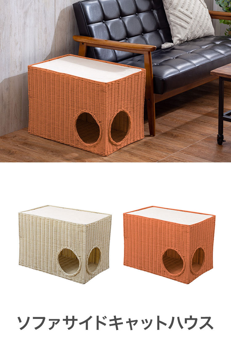 ラタン調 ソファサイドキャットハウス ハンドメイド 洗える ラタン風 猫 ちぐら かご バスケット トンネル付き 穴付き サイドテーブル ペットベッド 猫ベッド おしゃれ(代引不可)