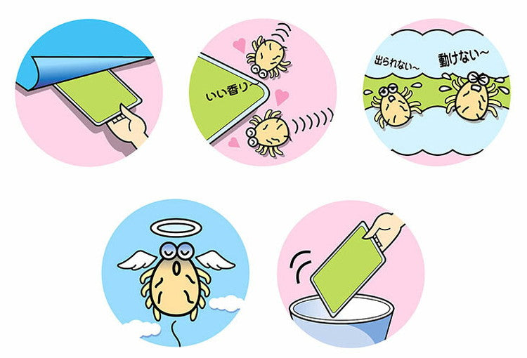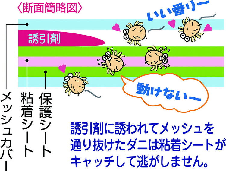 目に見えない場所で爆発的に繁殖しているダニ…特殊な誘引剤に誘われたダニがシートの中に入り、強力粘着剤がしっかりキャッチし死滅するので飛散の心配もありません。