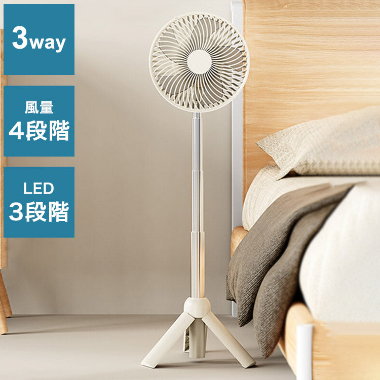 風量4段階調節。角度調節・首振り機能付き。LEDライト3段階調節。高さ約65~28cm調節可能。
