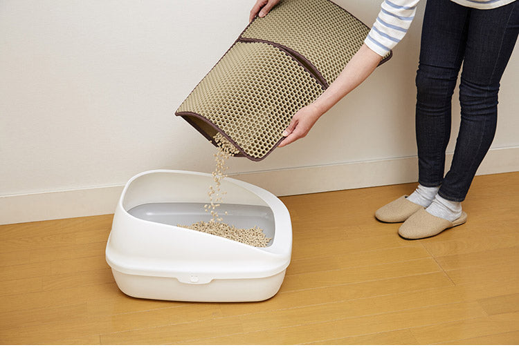 飛び散りを防ぎながら猫砂をまとめる便利マット。