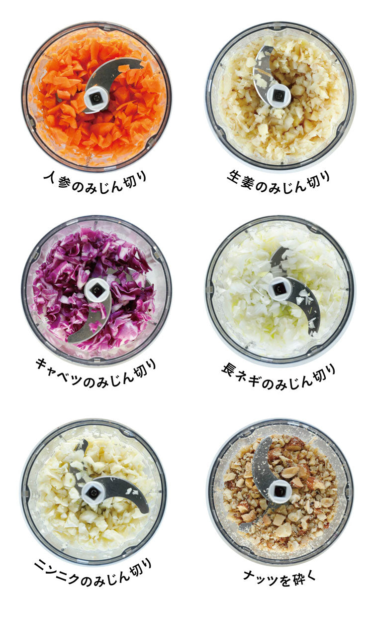 スイッチを押している間だけ細かく野菜が切れるのでお好みの厚さに調節が簡単。様々な料理で活躍します