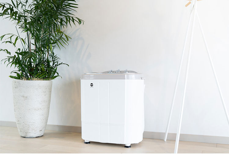 洗濯槽と脱水槽が分かれた2槽式コンパクトサイズで汚れが気になる衣類を洗いながら手洗いした小物を脱水など洗濯と脱水を同時進行できます。洗濯時間が短縮できる便利な1台。