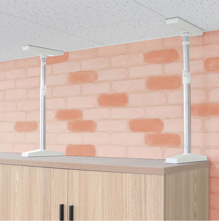 ネジやクギを使わないので、天井や家具を傷つけずに設置できます。スプリング付きの強力なジャッキ式で家具の転倒を防ぎます。