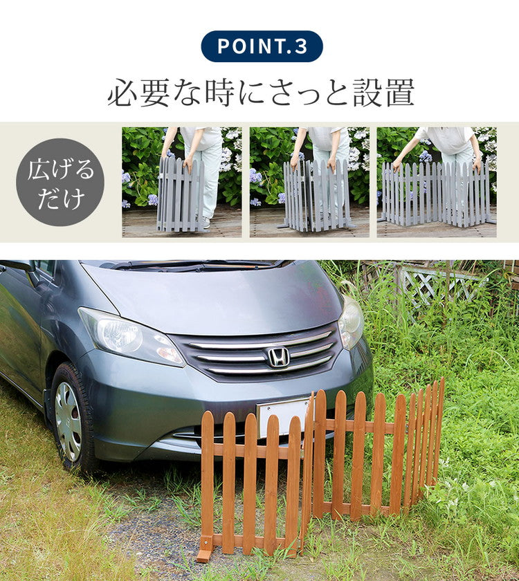 ジグザグ、コの字型、四角形など・・・。好きな形で自在に置ける、置くだけで空間を仕切れる木製フェンスです。自由な形に変えることができ、自立するので、使い勝手ばつぐんです。