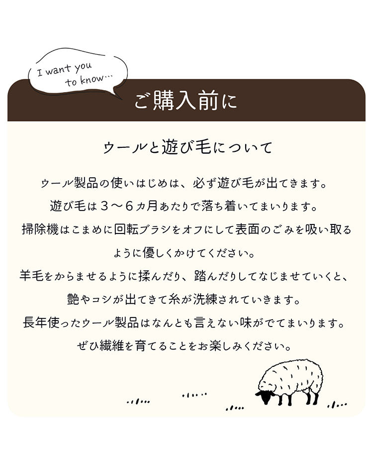 ※ウール製品のため遊び毛がでます。掃除機をお使いの場合は回転ブラシをオフして優しく吸い込んでください。