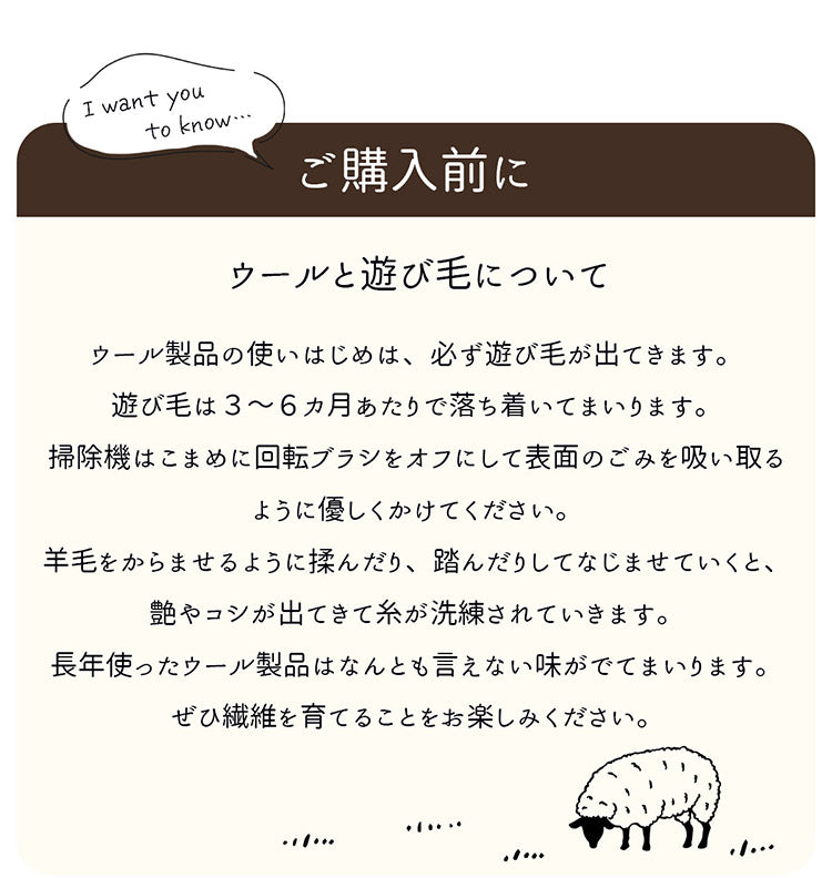 ※ウール製品のため遊び毛がでます。掃除機をお使いの場合は回転ブラシをオフして優しく吸い込んでください。