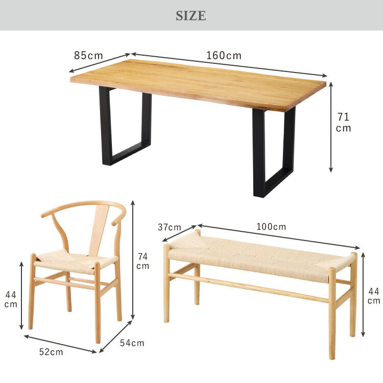 一枚板風 ダイニングテーブルセット 幅160 テーブル+チェア2脚+ベンチ 4点セット 4人掛け 天板浮造り仕上げ オーク無垢材 台形脚 北欧 ペーパーコード チェア おしゃれ(代引不可)