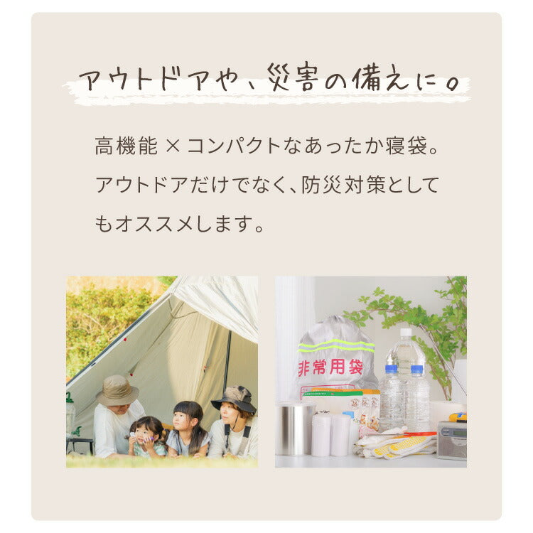 寝袋は使い方もいろいろ。車中泊や車の中で。アウトドアで。おうちでブランケット代わりに。掛布団として。防災用の備えにも役立ちます。老舗寝具メーカーの知識を詰め込んだ寝袋です。