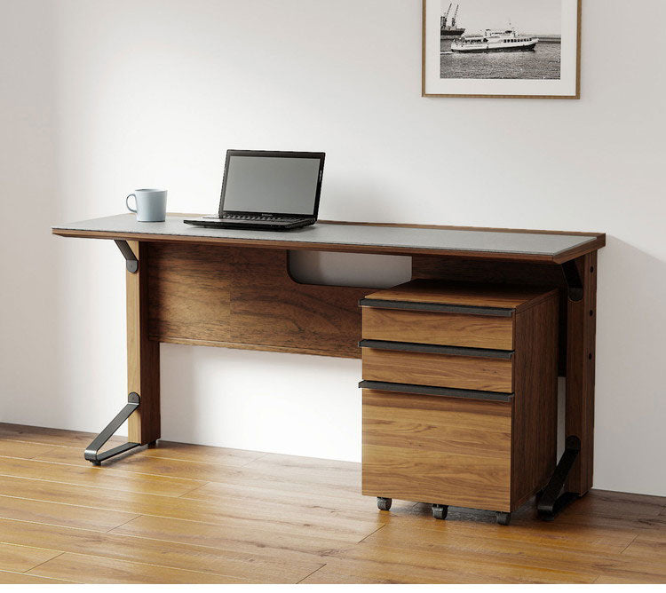 セラミック天板、天然杢突板、アイアンの異素材の組み合わせで高級感のあるデスクです。