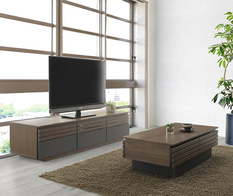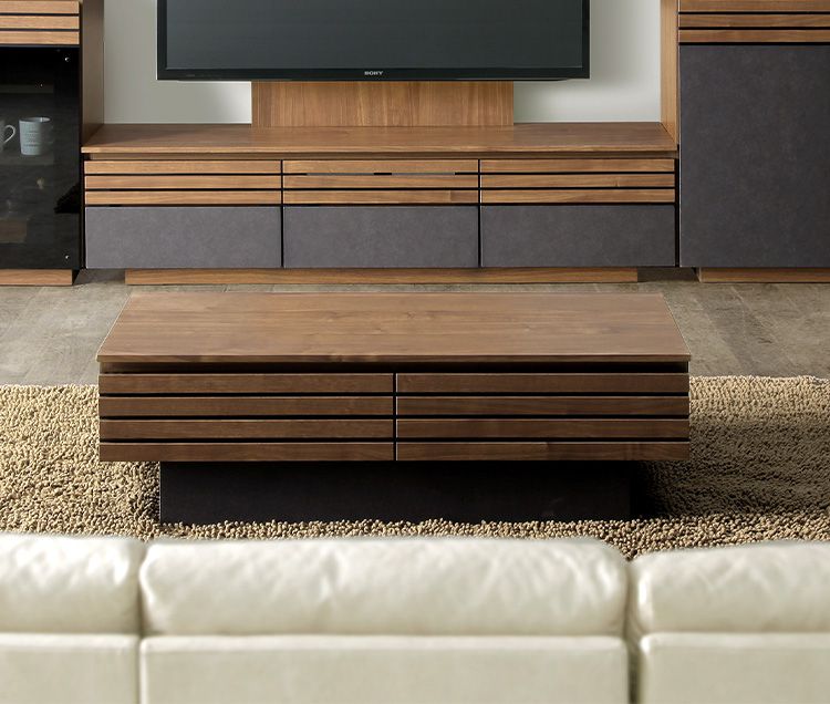 セラミック調シートとウォールナット柄のモダンな2トーンデザインのセンターテーブル。