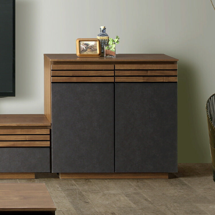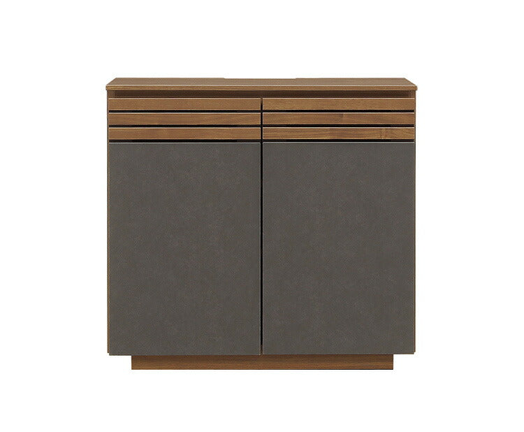 セラミック調シートとウォールナット柄のモダンな2トーンデザインのサイドボード。