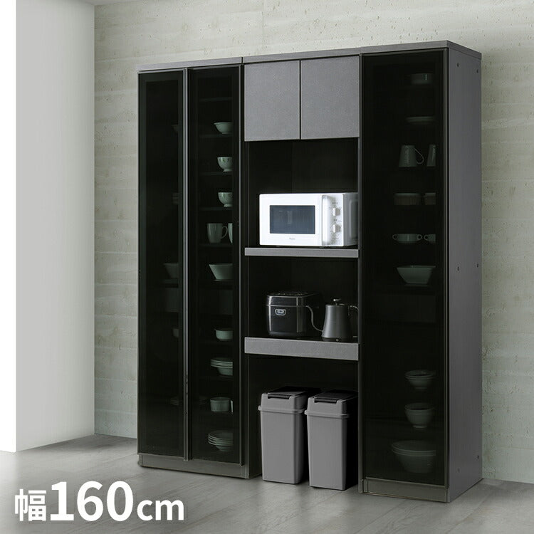 食器棚 幅160cm レンジボード 右開き ガラス戸 フルオープンレール ブラック レンジ台 キッチンボード ダイニングボード リビング ダイニング 台所 家族 ファミリー(代引不可)