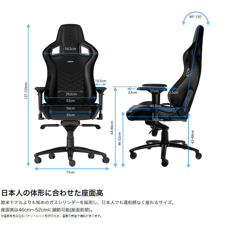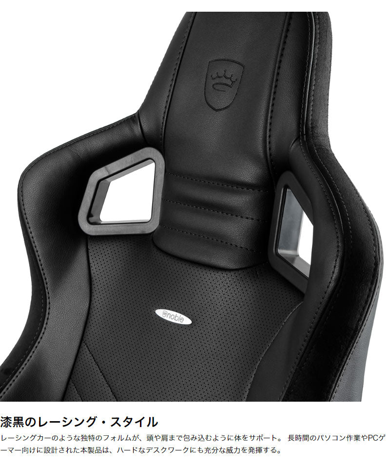 ・「noblechairs EPIC」は、1.5mm極厚PUレザー・55kg/m3高密度モールドウレタンを使用した高品質ゲーミングチェアです。