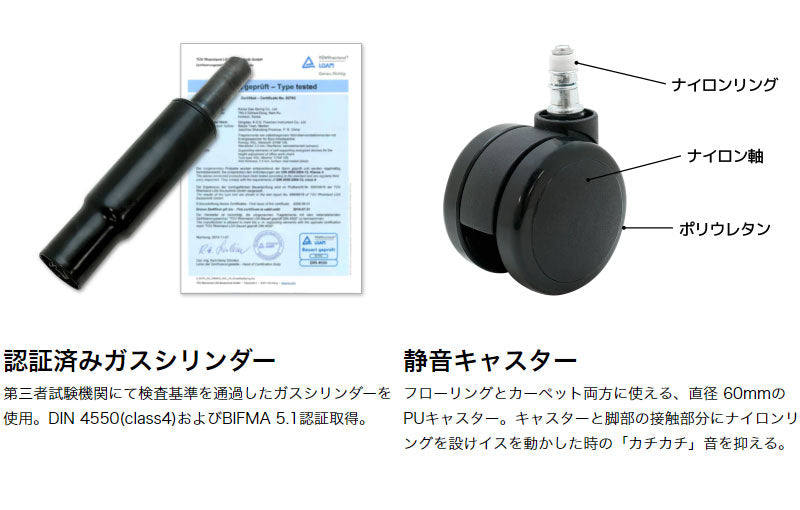 台座との接続部分にはナイロンリングを設けており、イスを動かしたときに「カチカチ」音がしません。