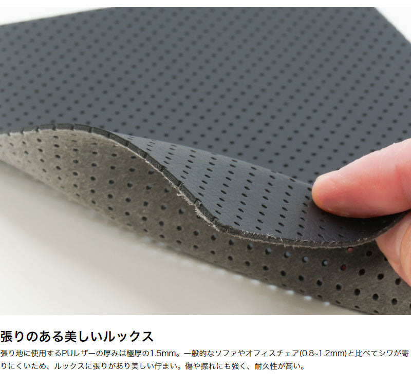 長時間体が触れる座面・背もたれには、穴の貫通したパンチングレザーを使用(直径1mm・孔間隔5mm)。
