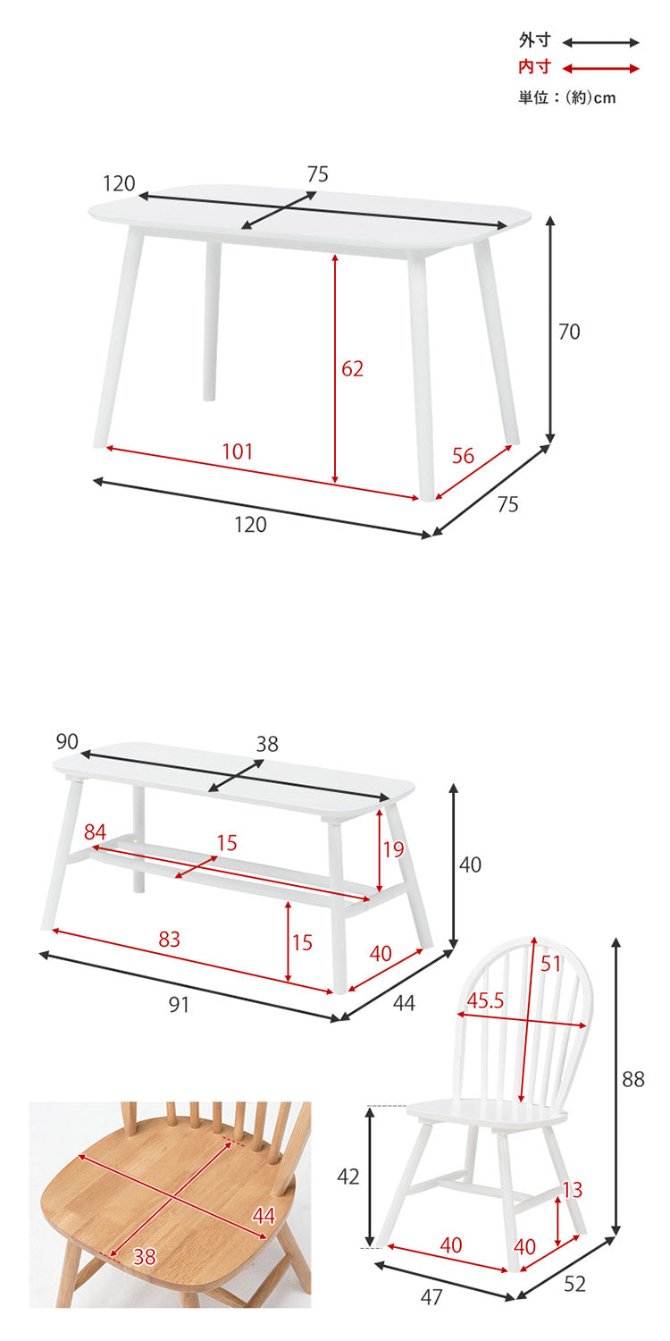 テーブル:(約)幅120×奥行75×高さ70cm、チェア:(約)幅47×奥行52×高さ88×座面高42cm、ベンチ:(約)幅91×奥行44×高さ40cm