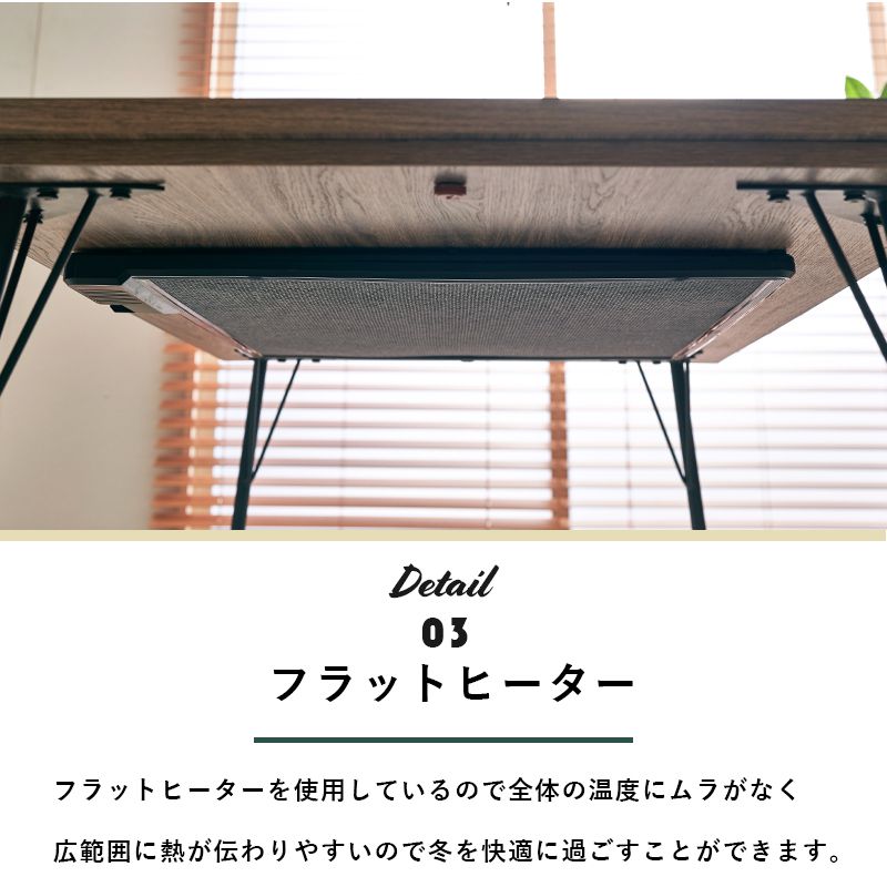 グレイッシュな木目調天板とスチール脚がブルックリンスタイルを感じさせるコタツテーブル。