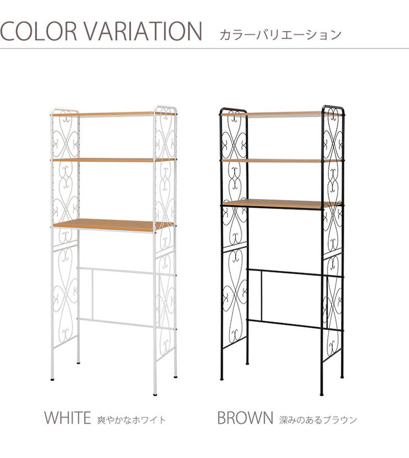 アイアンの曲線がエレガントで、洗濯機の上を有効活用できる洗濯機ラック。