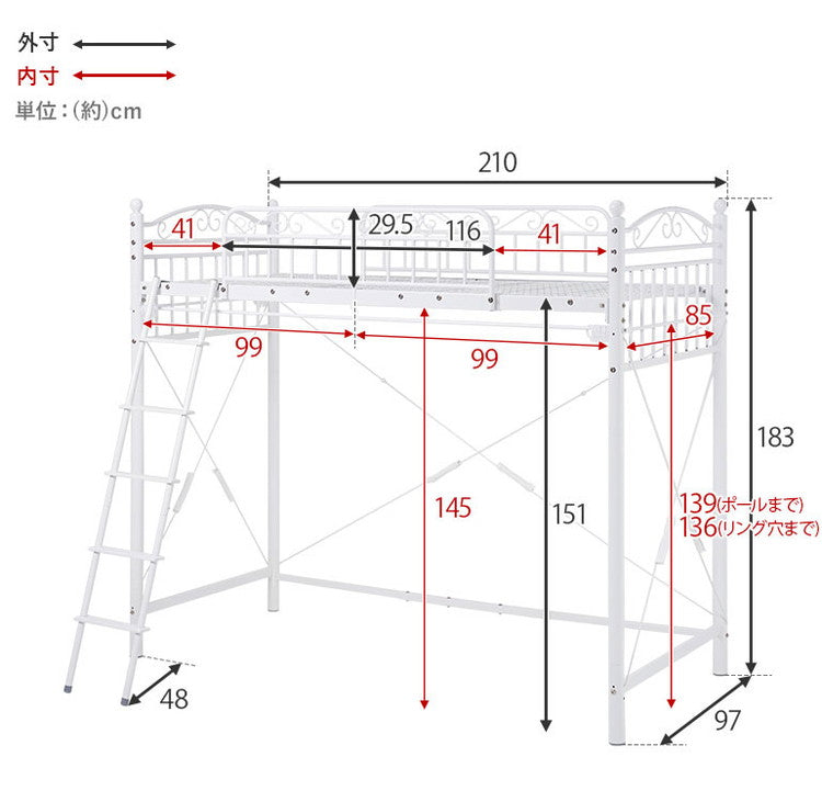 まるでプリンセスが住むお城のようなエレガントなデザインのパイプロフトベッドです。市販のカーテンを取り付けて使え、好きなものに囲まれた憧れの空間を作れるハイタイプ。