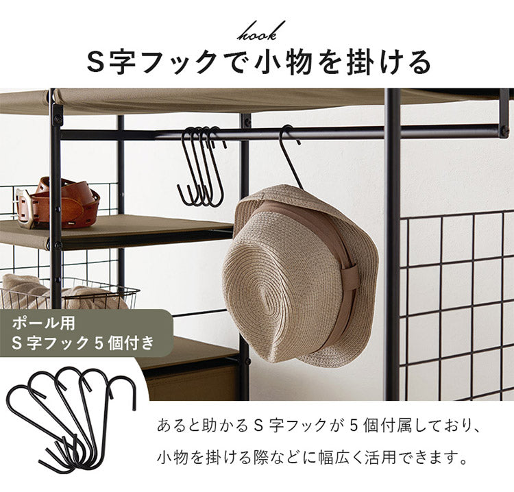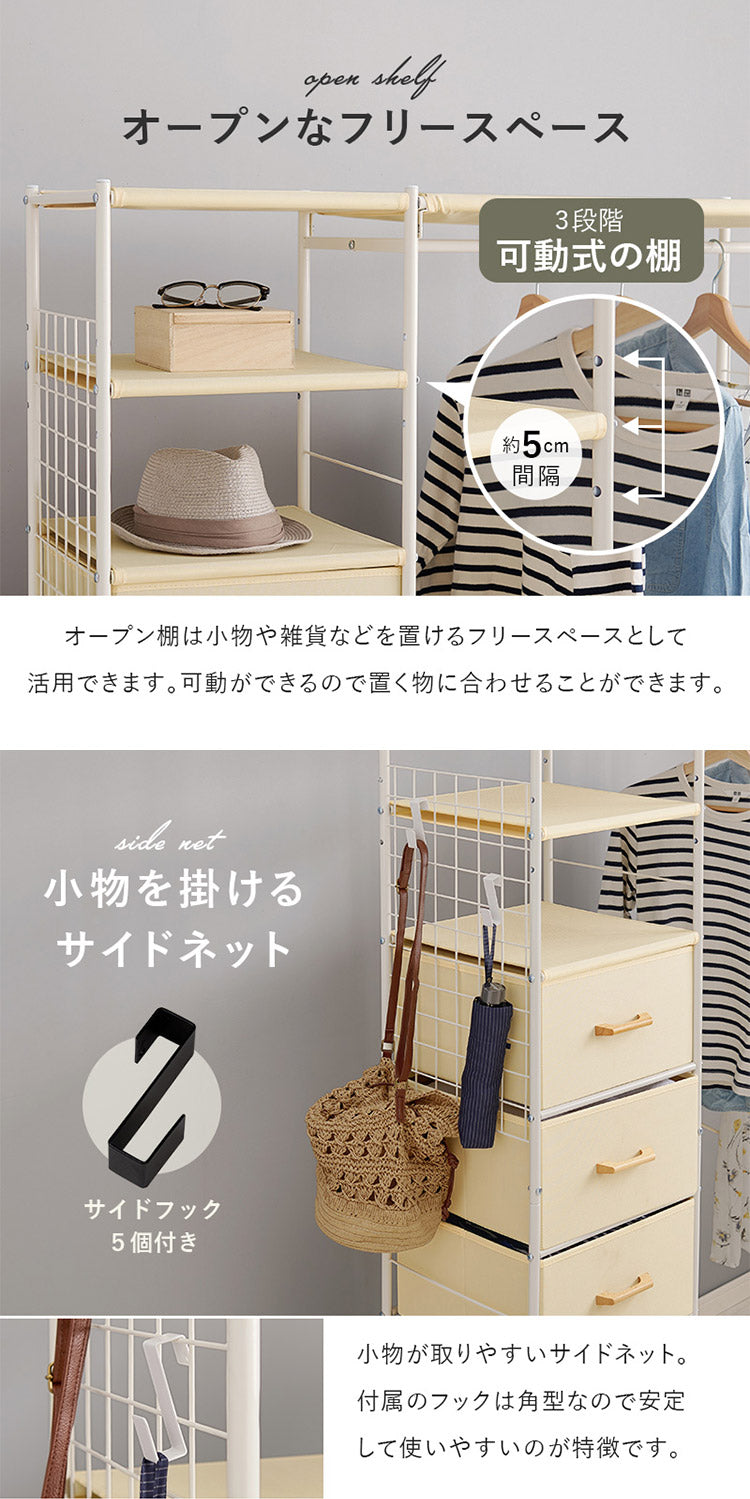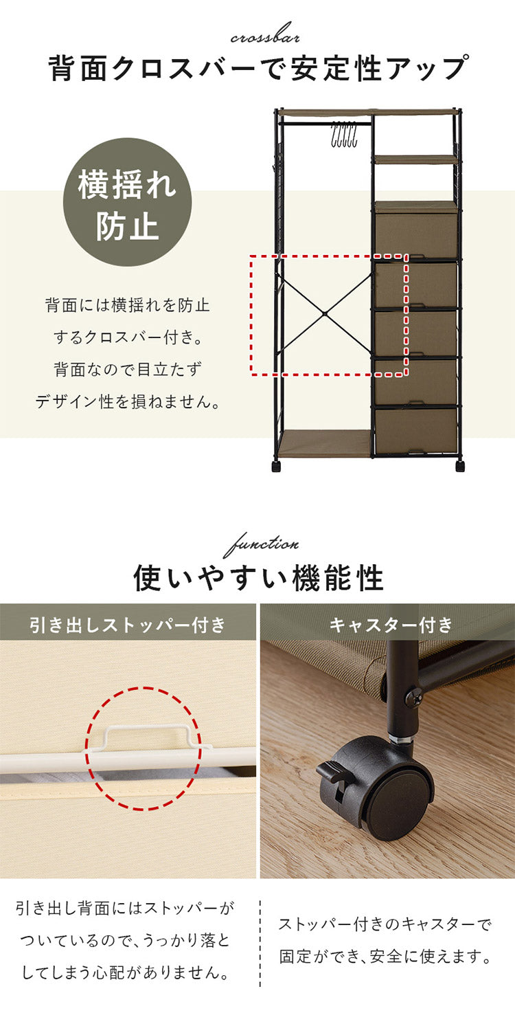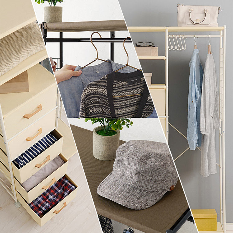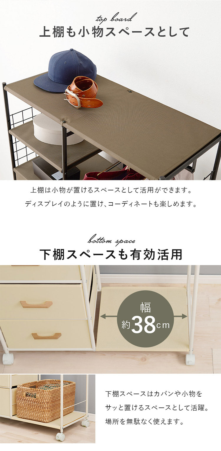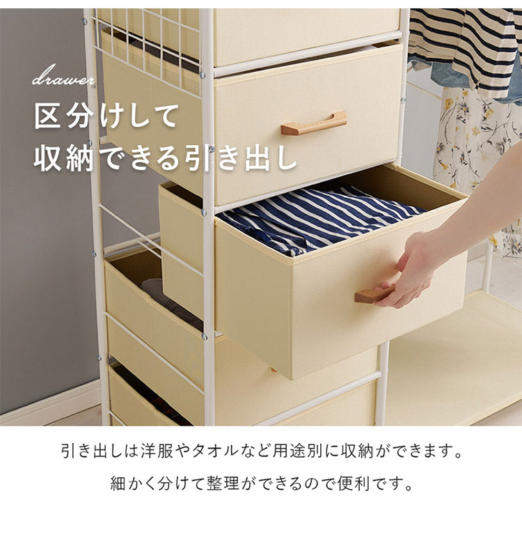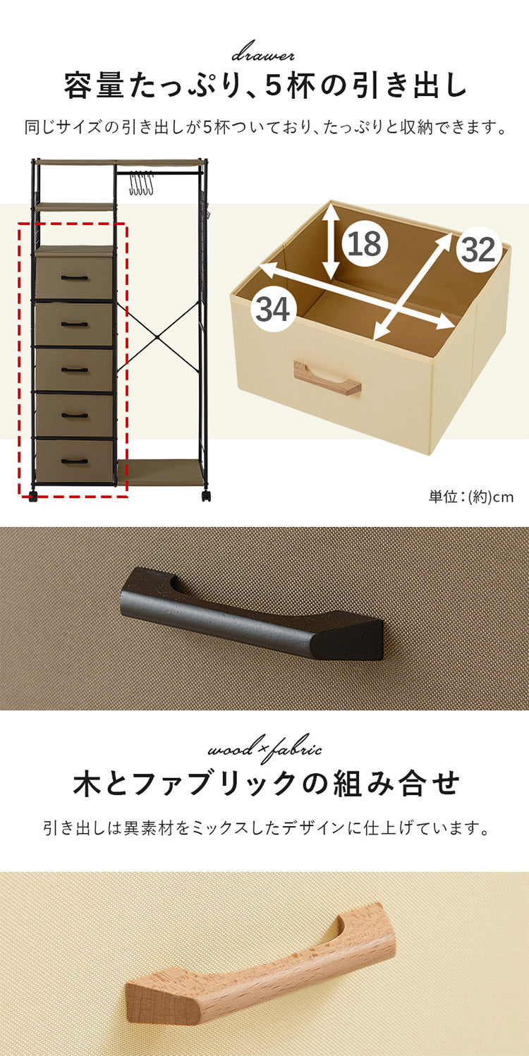ハンガー収納も引出し収納も1カ所に。ワンピースやコート、小物類もまとめて収納できます。キャスター付きで移動も楽々
