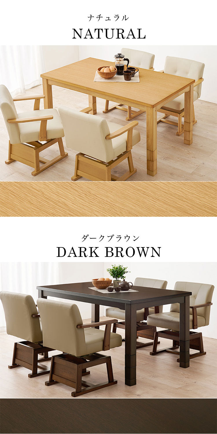 高さが6段階に変更できるこたつテーブル。ダイニングチェア、ソファ、座椅子などお使いの家具に合わせた高さに変更できます。