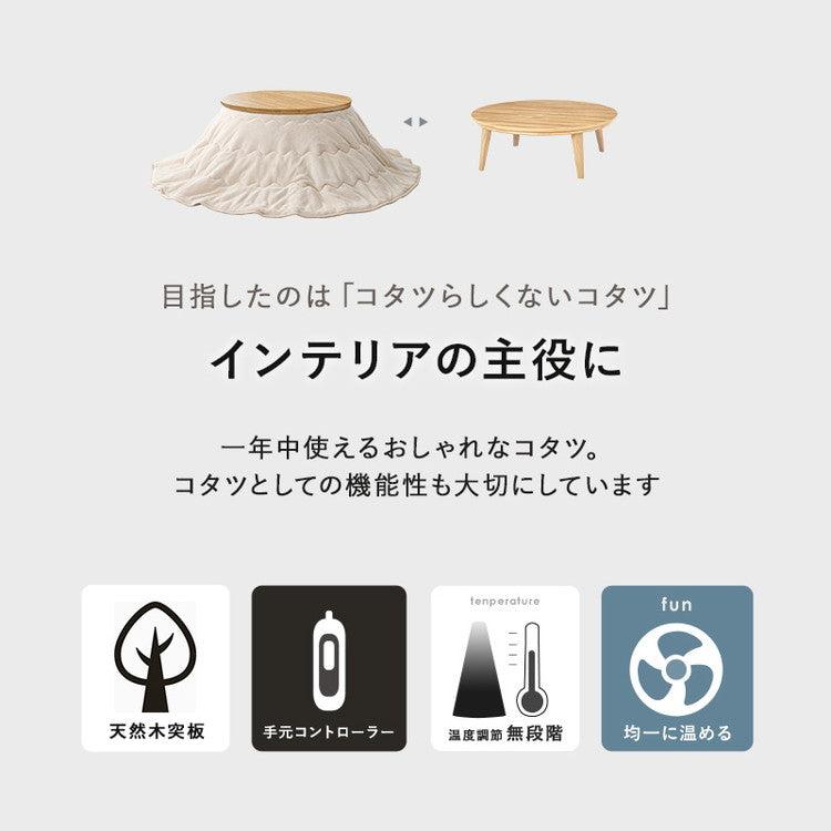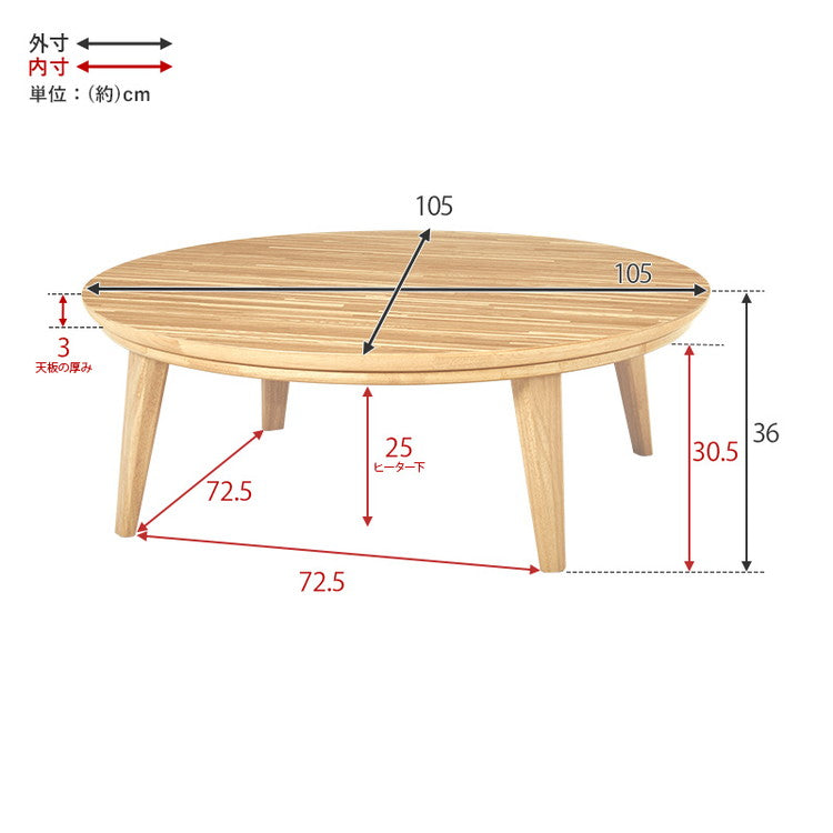 表情豊かな天然木突板を使用した洗練されたデザインの円形こたつです。幅105cm