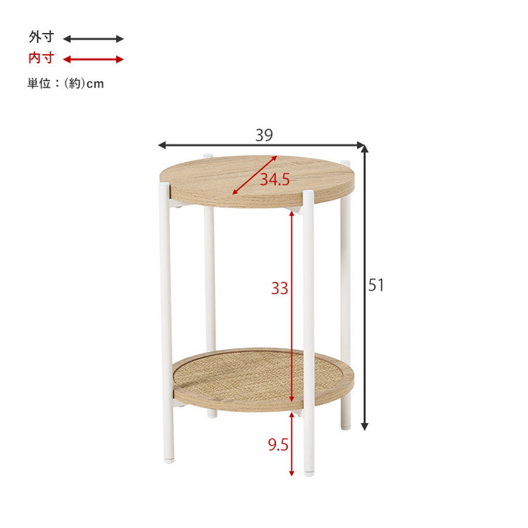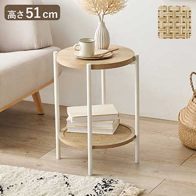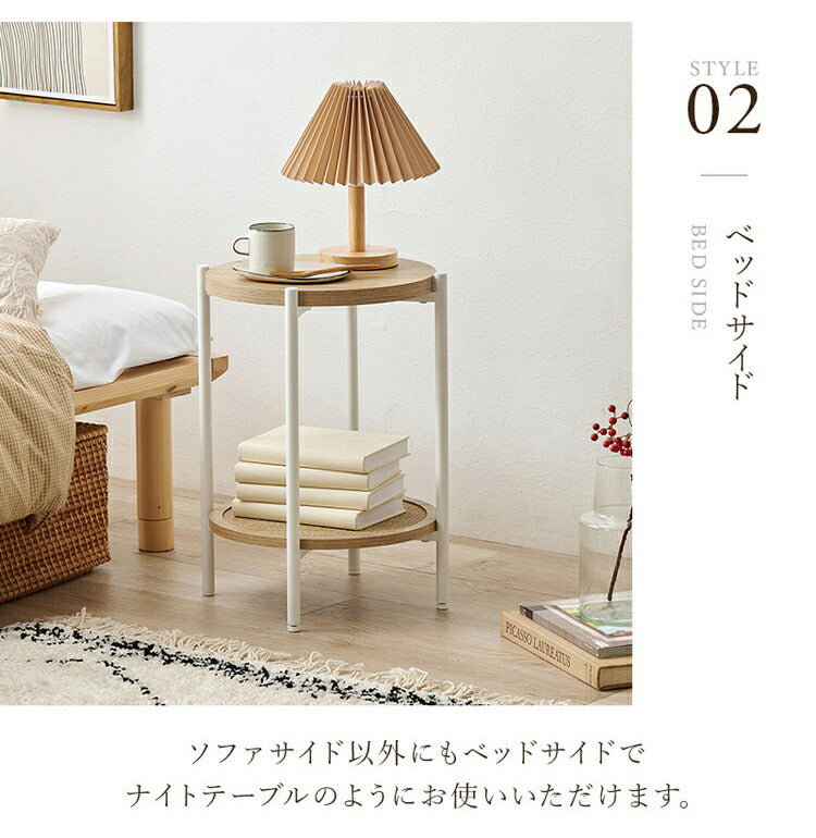 サイドテーブル 円形 ラタン調 こなれ感 おしゃれ オープンラック ナチュラル 韓国風インテリア 組立式 アジャスター付 かわいい 韓国インテリア ソファテーブル(代引不可)